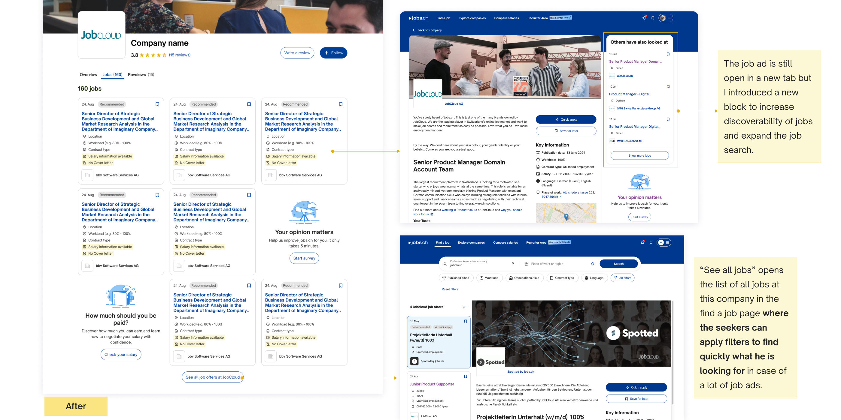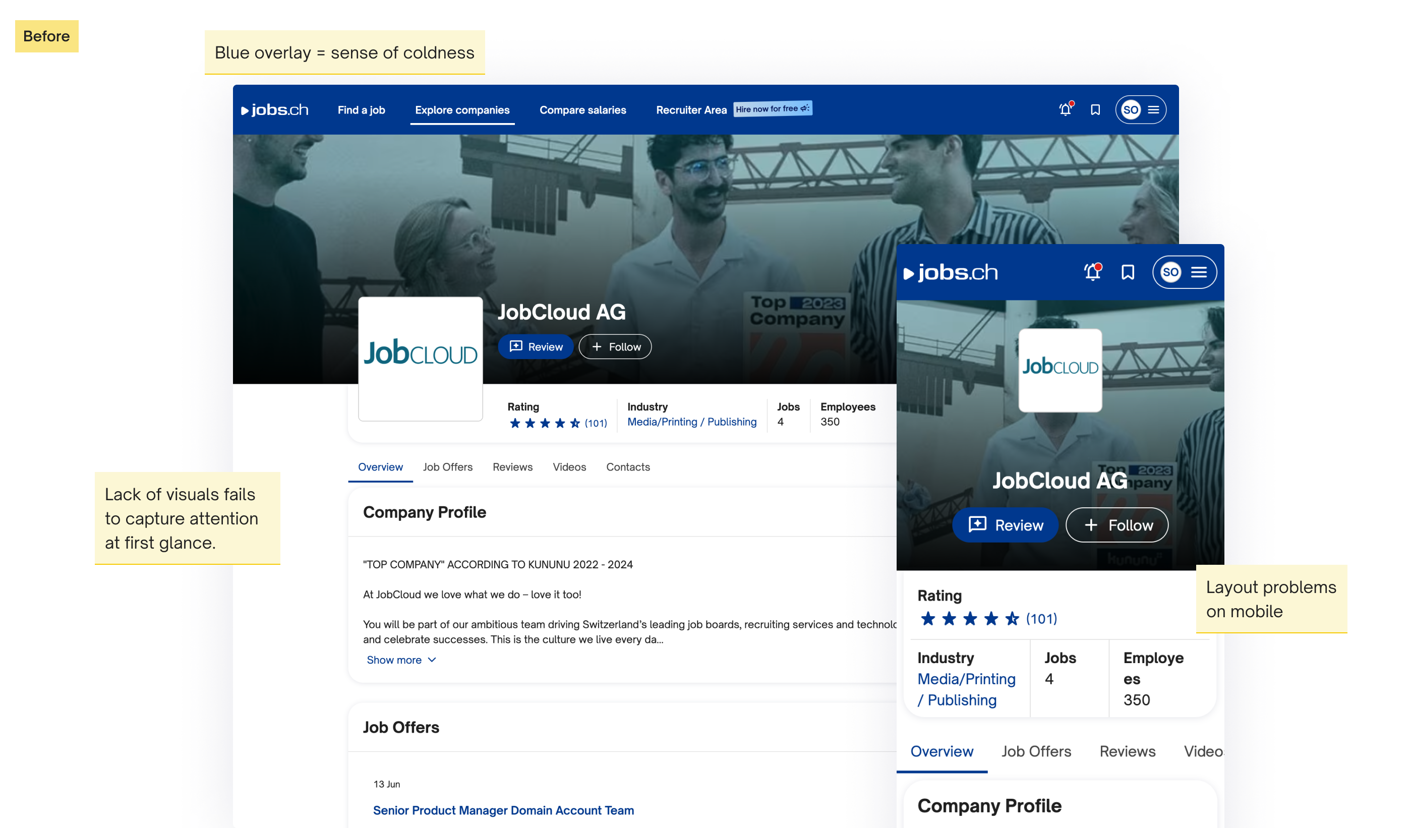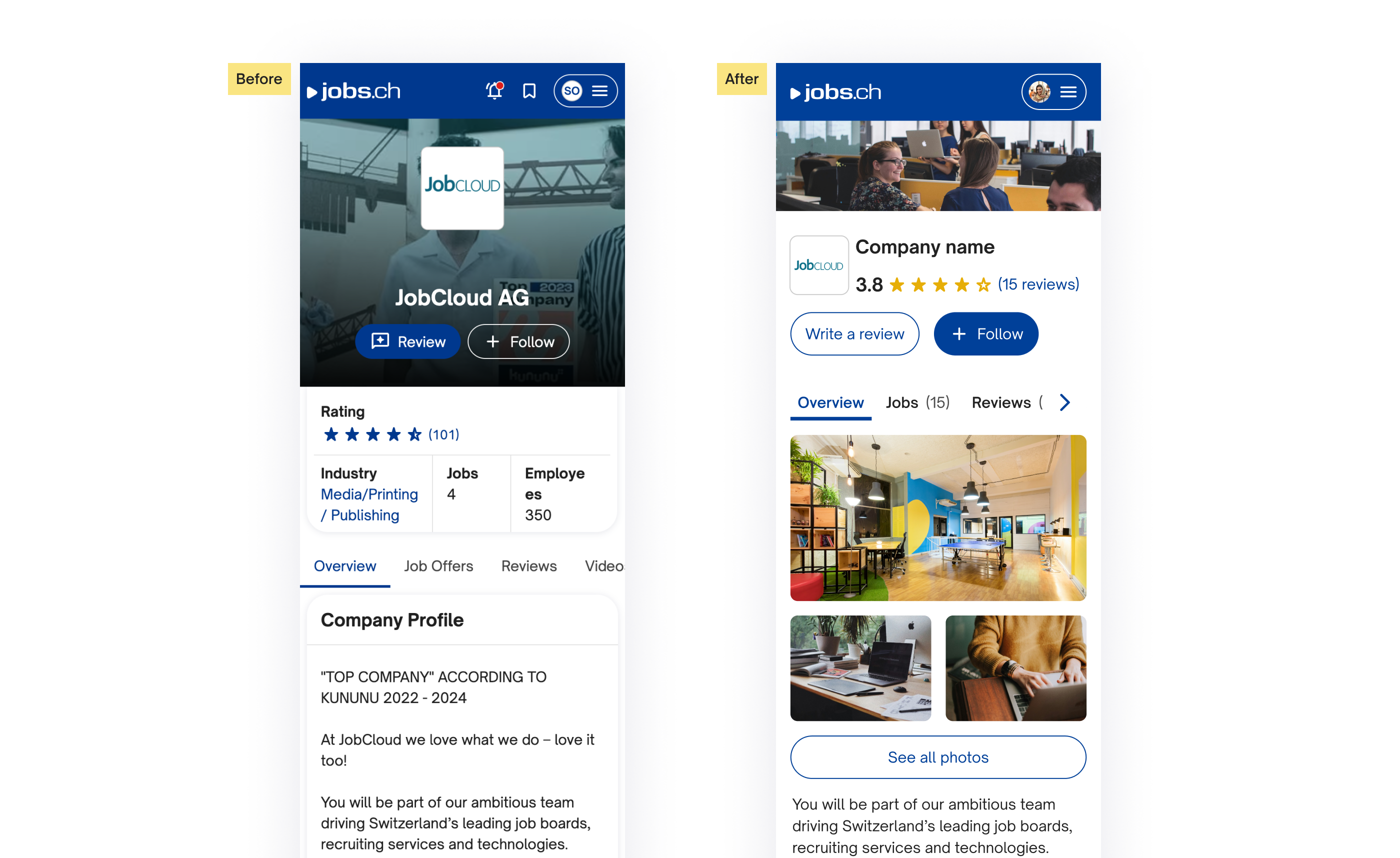 Outdated company profiles were failing to engage job seekers and led to fewer applications. I redesigned the experience with clearer ratings, a media gallery, and structured job listings to build trust and transparency. Six months after launch, time spent on profiles doubled and applications from profile pages increased by +5%, surpassing our initial goal.